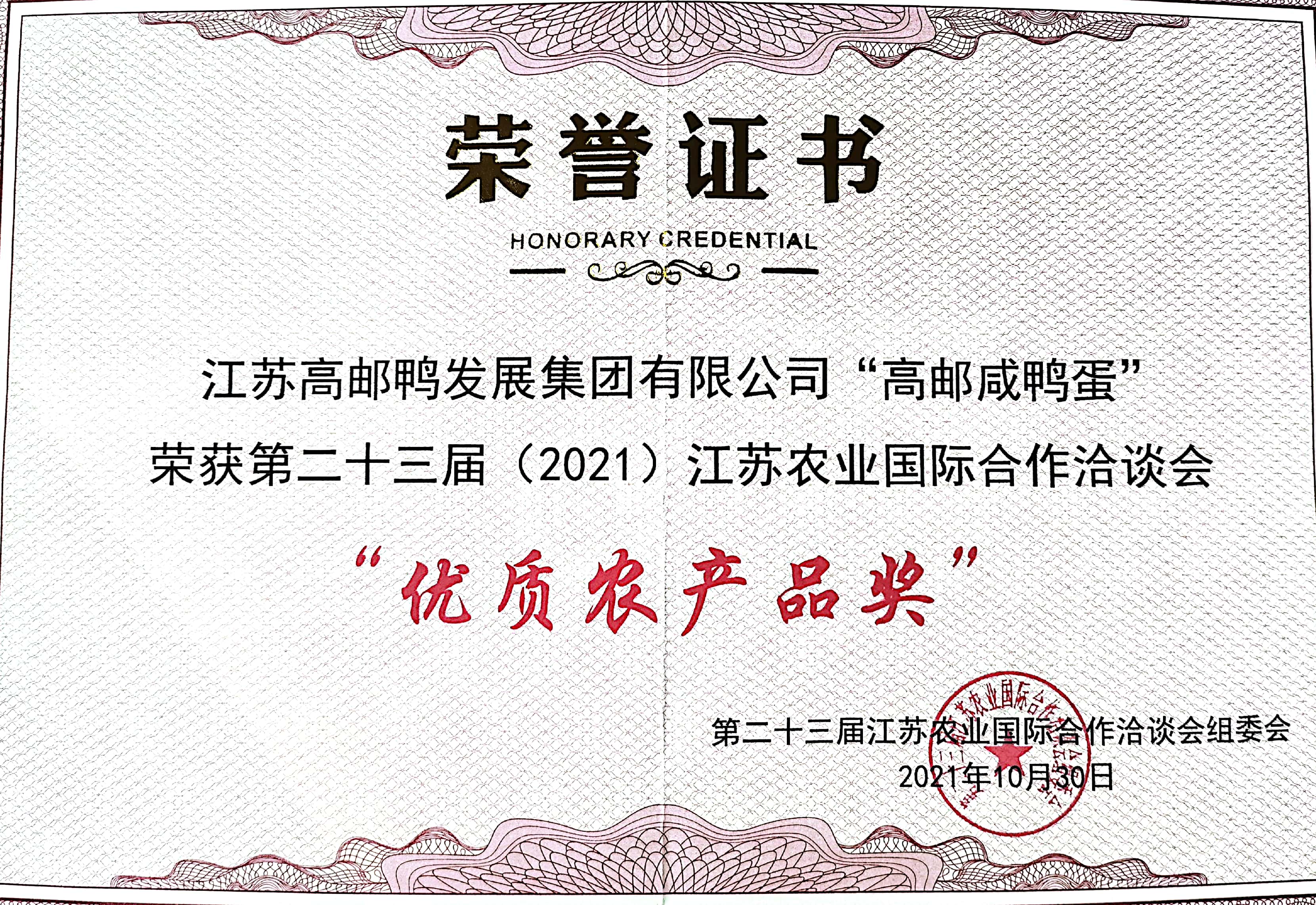 在10月30日上午舉辦的優(yōu)質(zhì)農(nóng)產(chǎn)品評(píng)選頒獎(jiǎng)活動(dòng)中,江蘇高郵鴨集團(tuán)“高郵咸鴨蛋”成功榮獲第二十三屆江蘇農(nóng)業(yè)國際合作洽談會(huì)“優(yōu)質(zhì)農(nóng)產(chǎn)品獎(jiǎng)”,這也是揚(yáng)州市獲此殊榮的兩家單位之一。