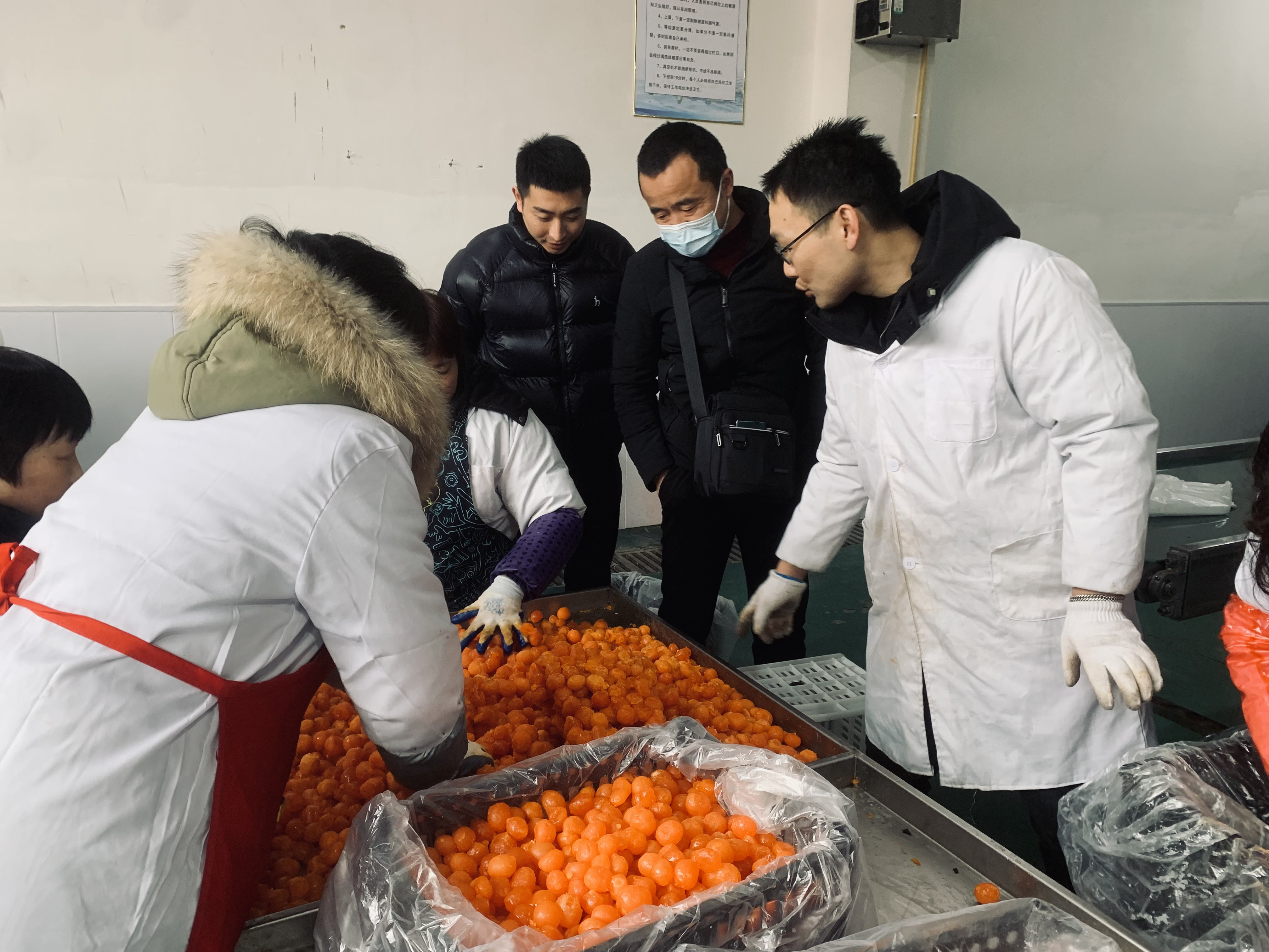 2月16日上午,在銷售公司人員的帶領下一同前往加工廠圍繞咸蛋黃批量采購事宜進行了現場考察,并與加工廠技術負責人進行了經驗交流和溝通。羅總考察了各不同級別蛋黃后對高郵鴨集團的蛋黃品質高度認可,羅總的認可為公司開拓安徽市場提供信心、為進一步合作奠定基礎。