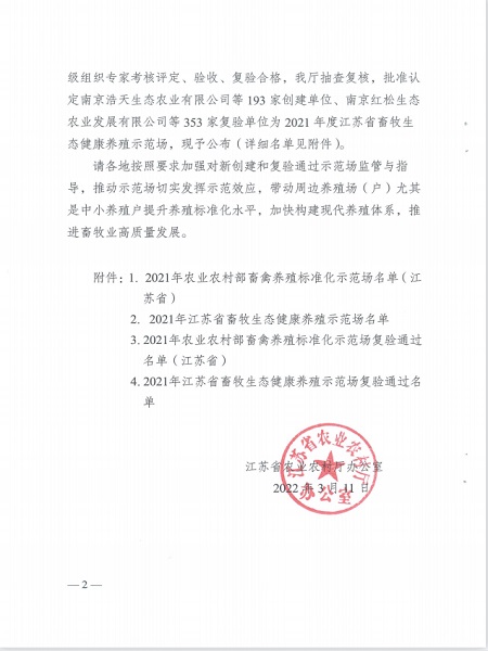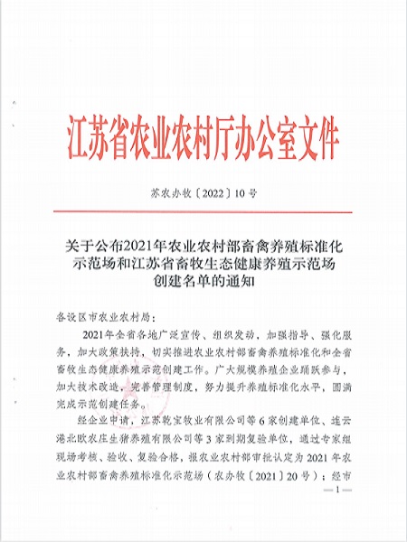近日,高郵鴨集團從江蘇省農業農村辦公室文件獲悉,江蘇高郵鴨發展集團有限公司獲評“2021年江蘇省畜牧生態健康養殖示范場”。