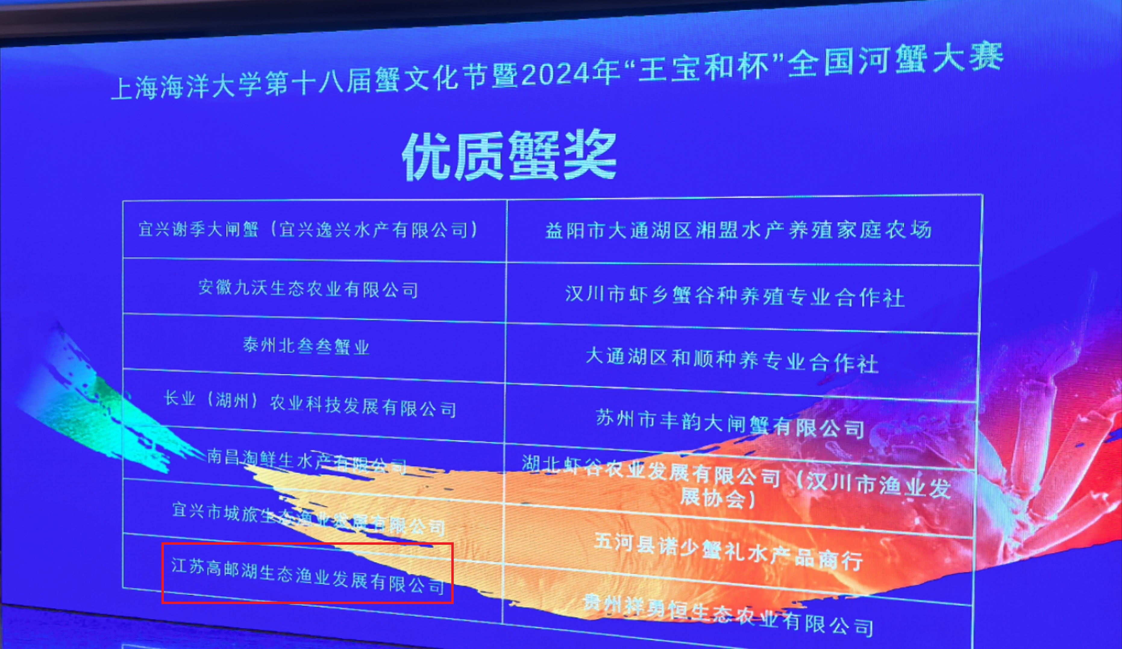 漁業公司榮獲上海海洋大學2024年“王寶和”杯全國河蟹大賽“優質蟹獎”