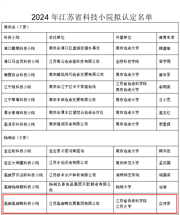 高郵鴨集團入選2024年江蘇省科技小院認定名單