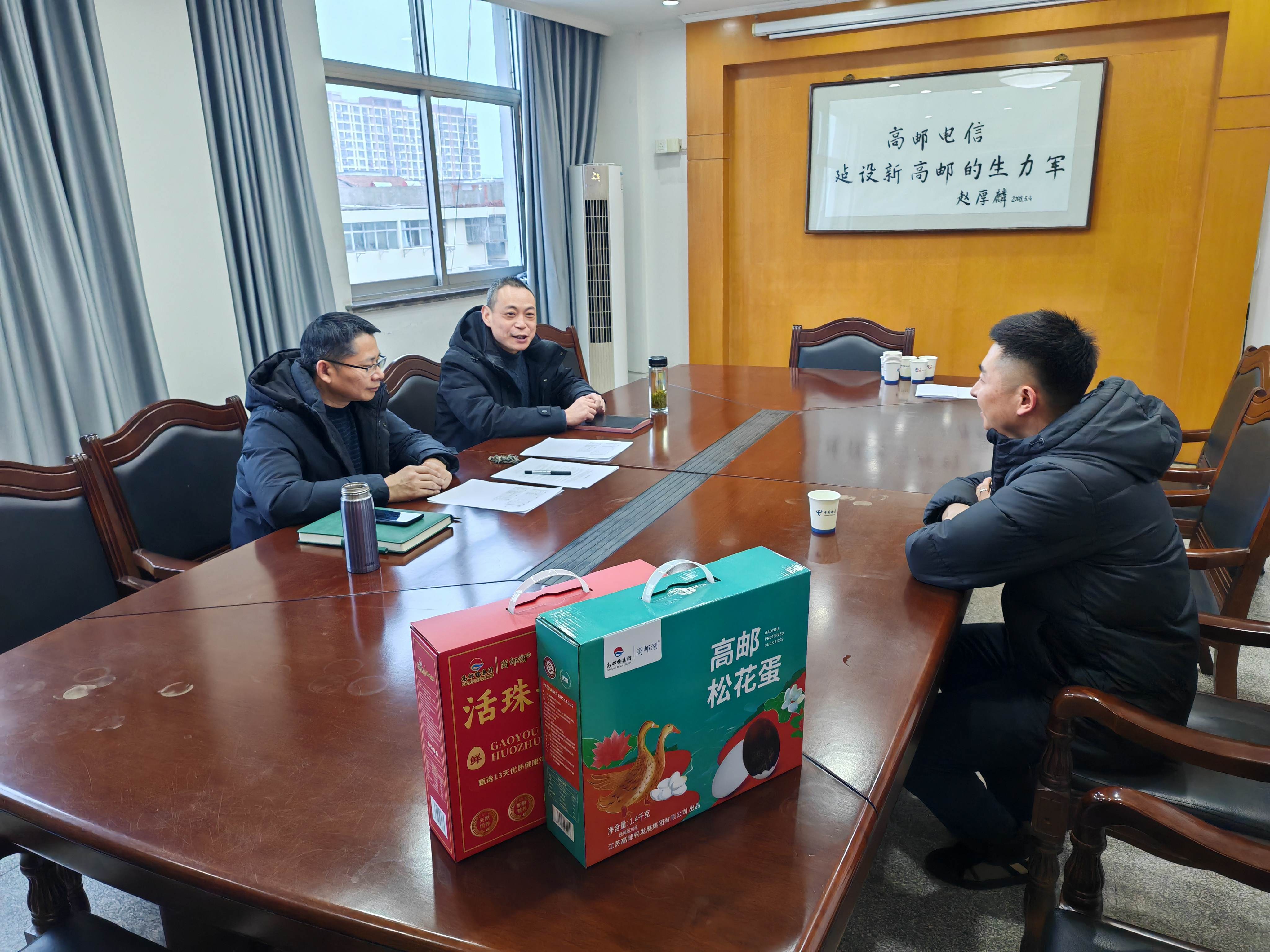 1月14日下午,鴨集團食品公司相關負責人帶隊前往中國電信高郵分公司,與中國電信高郵分公司采購團隊就蛋品禮盒的采購事宜展開深入交流。