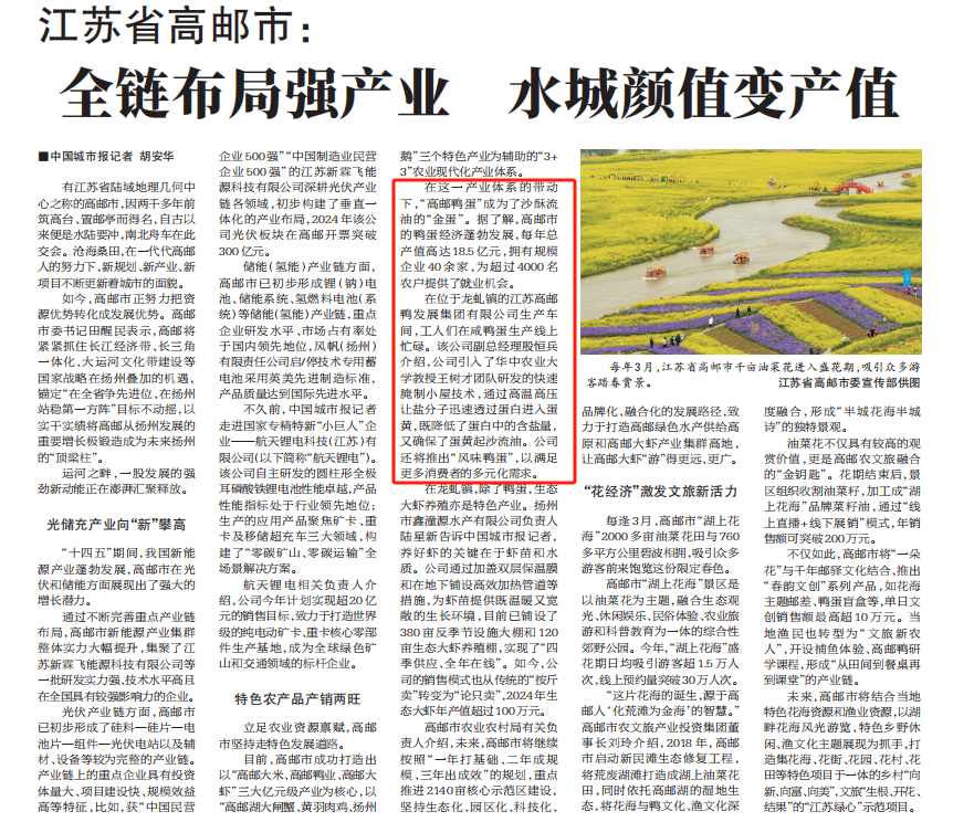 目前,高郵市成功打造出以“高郵大米、高郵鴨業、高郵大蝦”三大億元級產業為核心,以“高郵湖大閘蟹、黃羽肉雞、揚州鵝”三個特色產業為輔助的“3+3”農業現代化產業體系。