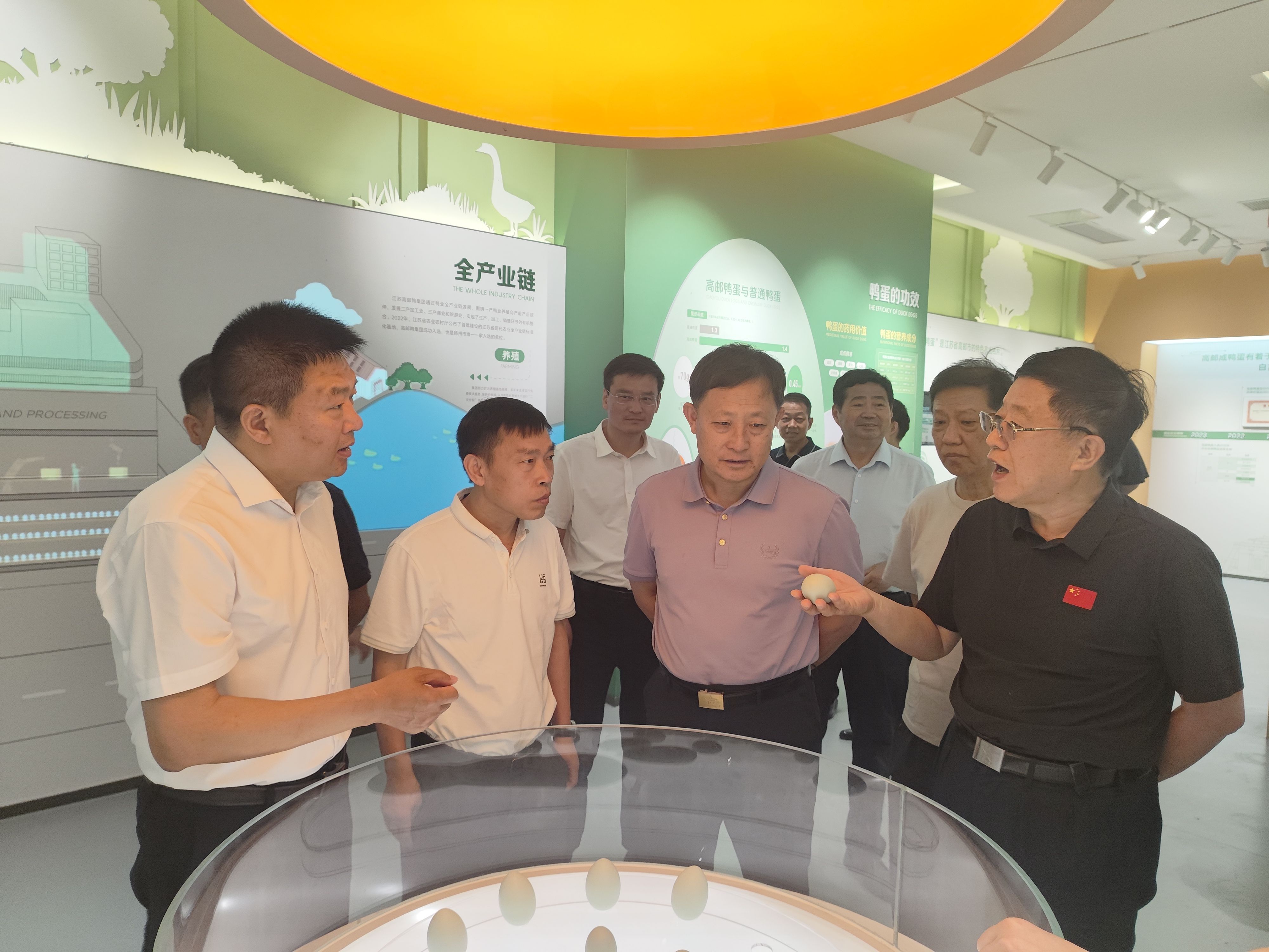 臧傳勛一行先后實地考察高郵鴨集團文化展廳、食品加工標準化一期廠房及養殖基地,詳細聽取了關于高郵鴨蛋的歷史淵源、高郵鴨集團發展歷程、高郵鴨現代化養殖及高郵鴨蛋加工銷售等方面的介紹。