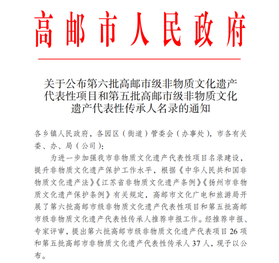 近日,高郵市人民政府發布《關于公布第六批高郵市級非物質文化遺產代表性項目和第五批高郵市級非物質文化遺產代表性傳承人目錄的通知》。